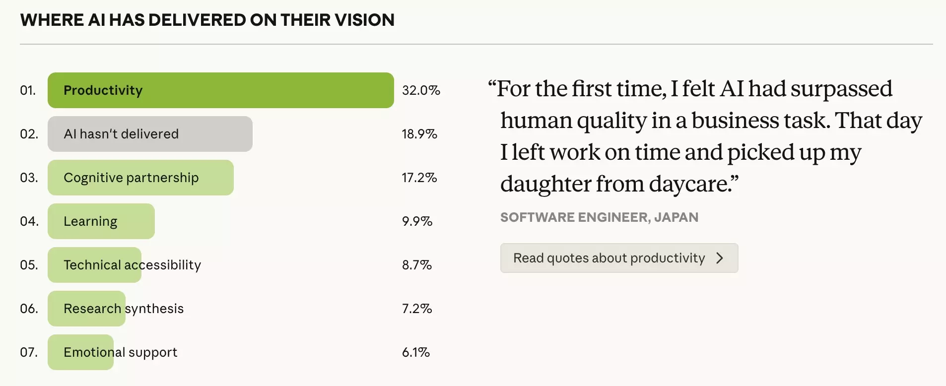 অ্যানথ্রোপিক সমীক্ষা অনুসারে, পেশাগত ক্ষেত্রে এআই-এর ব্যবহার এখন পর্যন্ত সবচেয়ে বেশি প্রত্যাশিত। অংশগ্রহণকারীদের একটি উল্লেখযোগ্য অংশ বিশ্বাস করেন যে এই প্রযুক্তিগুলো কিছু পুনরাবৃত্তিমূলক কাজ স্বয়ংক্রিয় করার মাধ্যমে তাদের কাজের দক্ষতা উন্নত করতে পারে।