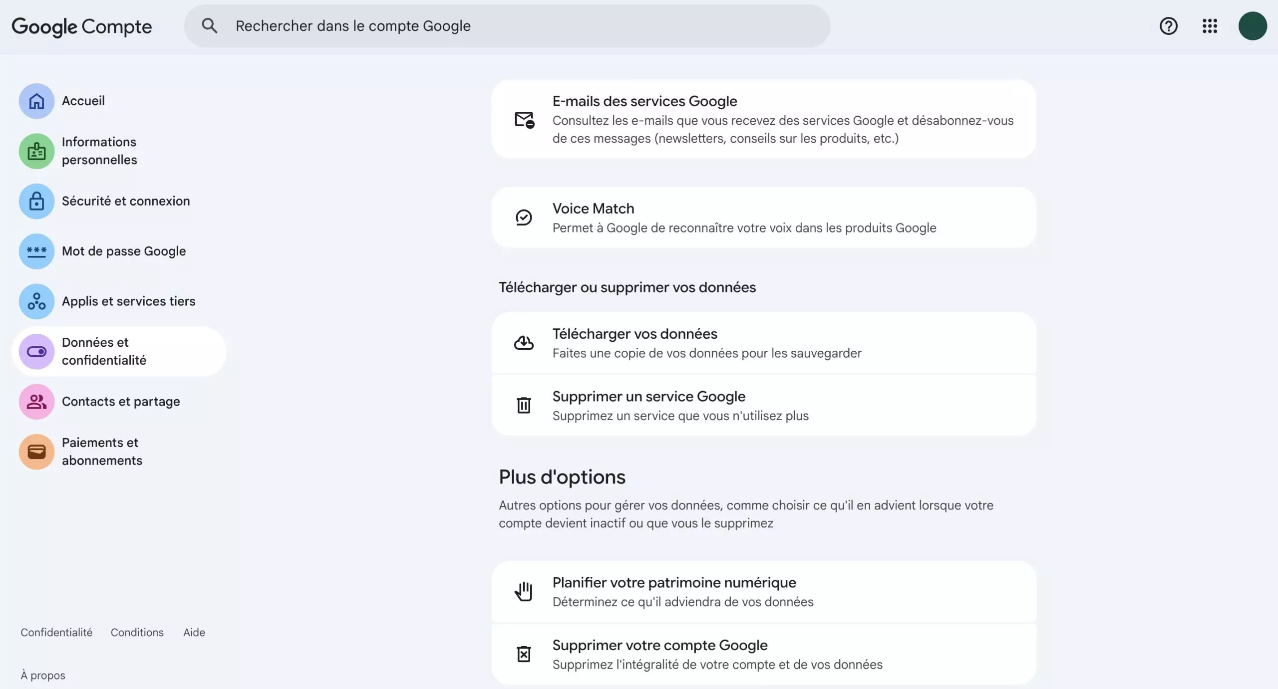 V této části můžete spravovat všechny informace spojené s vaším účtem Google: historii, nastavení soukromí, export dat nebo smazání služeb.