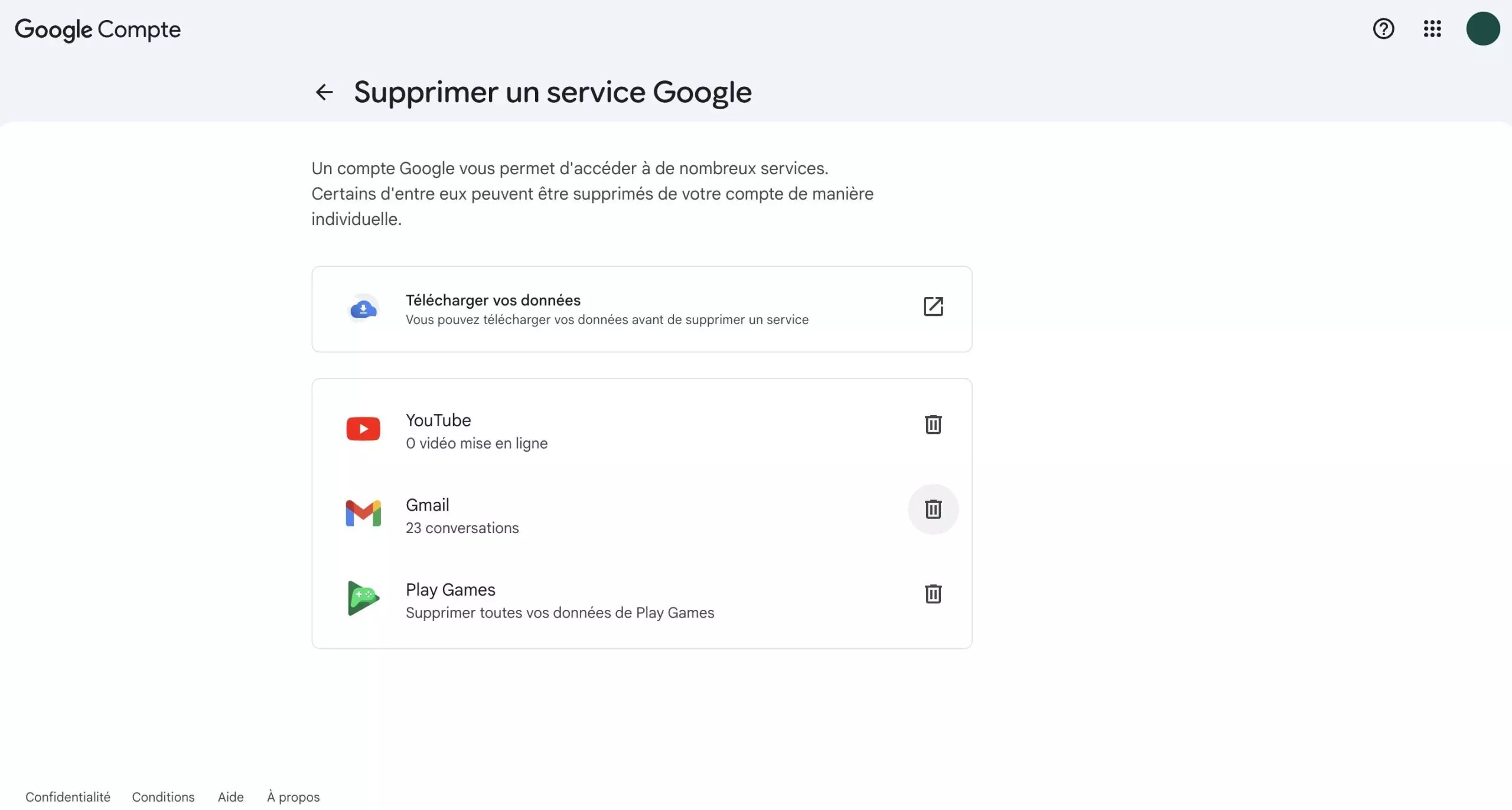 Než kliknete na tlačítko pro smazání účtu Gmail, můžete si v případě potřeby zálohovat data kliknutím na „Stáhnout data“.