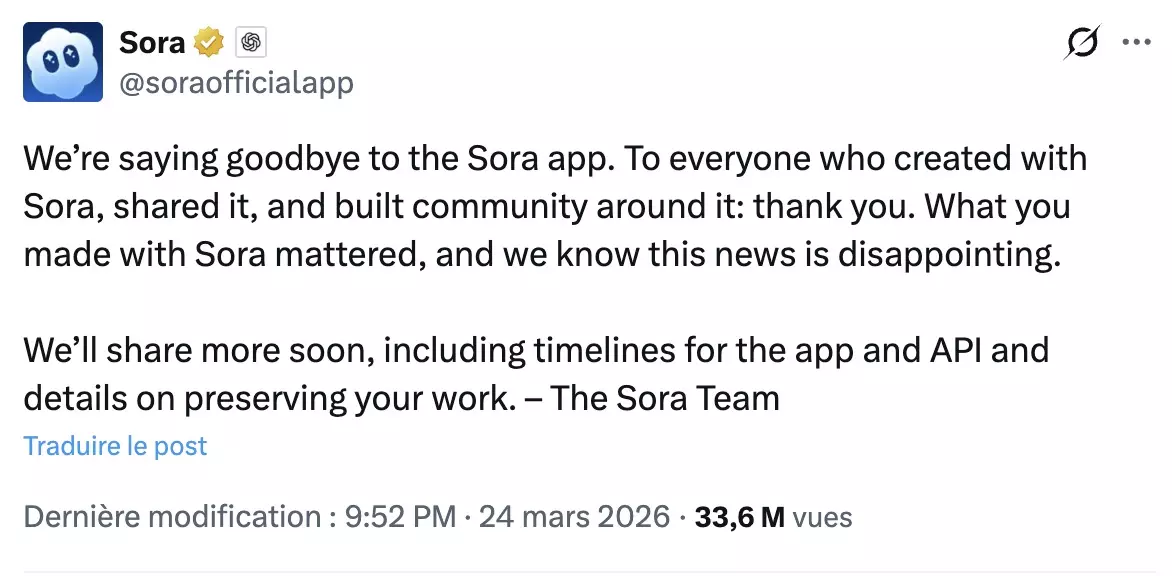 Il messaggio pubblicato su X da OpenAI è esplicito: ringrazia tutti coloro che hanno creato, condiviso e costruito una community con Sora. Sei mesi dopo la sua ascesa fulminea, Sora è stata appena dismessa. Nessuno se lo aspettava, quindi perché una decisione del genere? Sora aveva ottenuto quasi un milione di download in meno di cinque giorni. Aveva persino raggiunto la prima posizione sull'App Store di Apple.