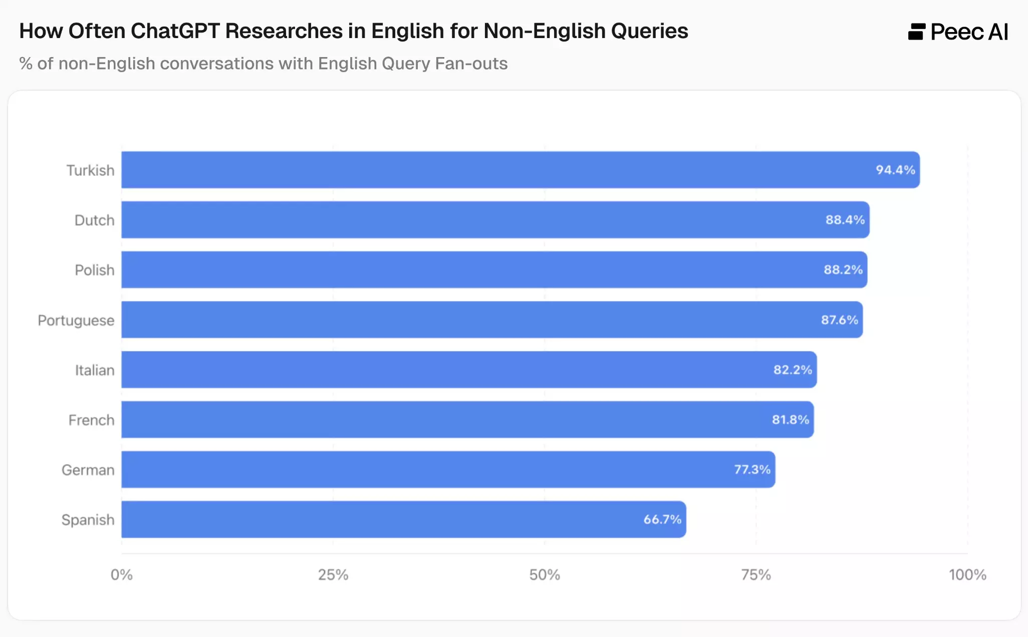 According to the report, 43% of these internal queries are made in English, even when the initial question is asked in another language. But even more revealing, in 78% of the cases studied, an English search occurs at least once in the response construction process.