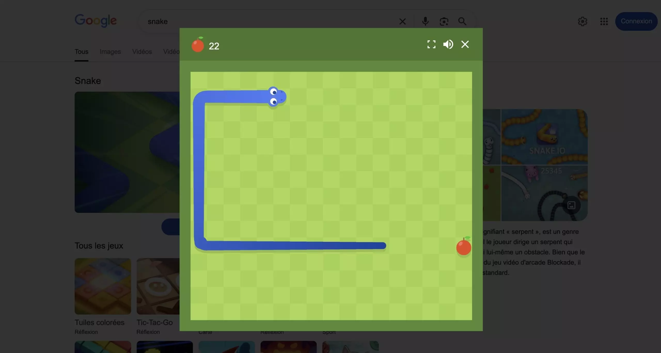 同样,在谷歌上,只需搜索“贪吃蛇”即可立即开始游戏。游戏目标不变:尽可能多地吃苹果,同时避免撞到墙壁或撞到自己。